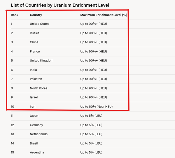 ایران با دستیابی به غنیسازی ۶۰ درصد بهصورت بومی (تأییدشده توسط IAEA در گزارشهای ۲۰۲۳-۲۰۲۵) به دهمین کشور این فهرست تبدیل شده است.