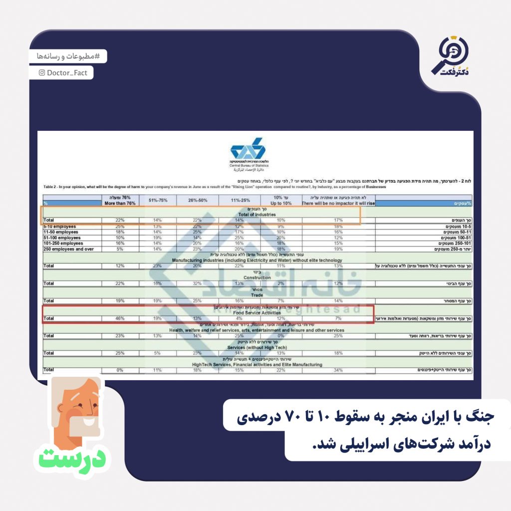 👨⚕️دکتر فکت: این گزارش نشان میدهد جنگ اخیر ایران و اسرائیل ضربه شدیدی به ساختار اقتصادی اسرائیل وارد کرده، مخصوصاً در بخشهای خدماتی، خوراک، ساختوساز و تجارت خردهفروشی و این ادعا که جنگ با ایران منجر به سقوط ۱۰ تا ۷۰ درصدی درآمد شرکتهای اسراییلی شد، #درست است.