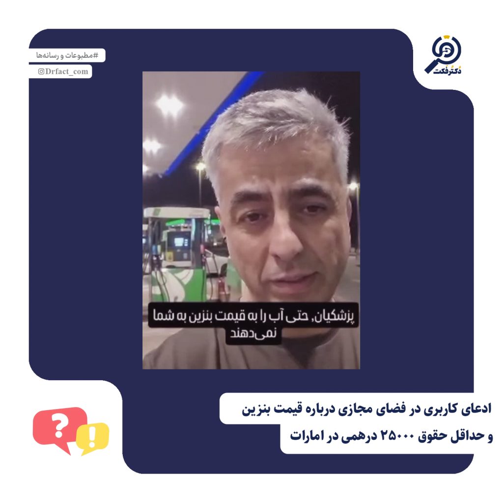 ⁉️ اخیراً ویدیویی در شبکههای اجتماعی منتشر شده که در آن فردی مدعی میشود حداقل حقوق در امارات متحده عربی بین ۲۰ تا ۲۵ هزار درهم است. او در واکنش به سخنان رئیسجمهور ایران که گفته بود «در ایران حتی آب را به قیمت بنزین نمیدهند»، گفته است که در امارات، بنزین لیتری ۲.۶ تا ۲.۸ درهم است و در کنار آن، حقوقها بسیار بالاست.