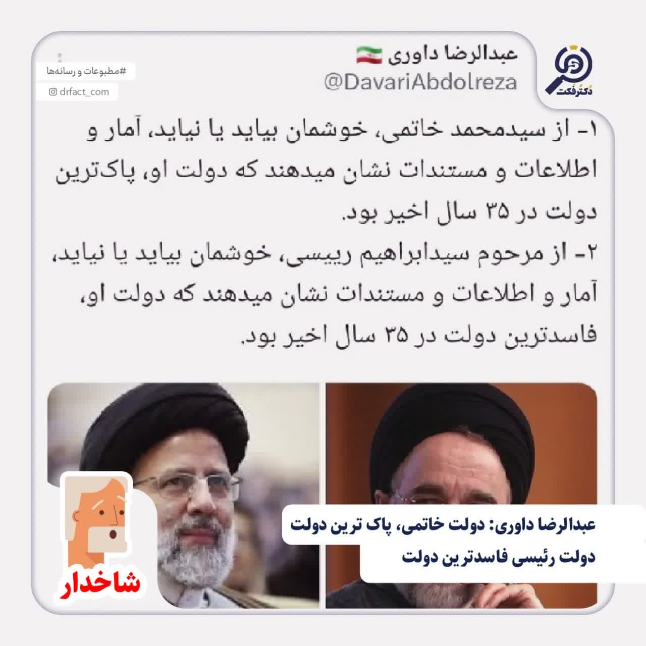 👨⚕️دکتر فکت: این مطلب که دولت خاتمی، پاک ترین دولت ها و دولت رئیسی فاسدترین دولت جمهوری اسلامی بوده،#شاخدار است.