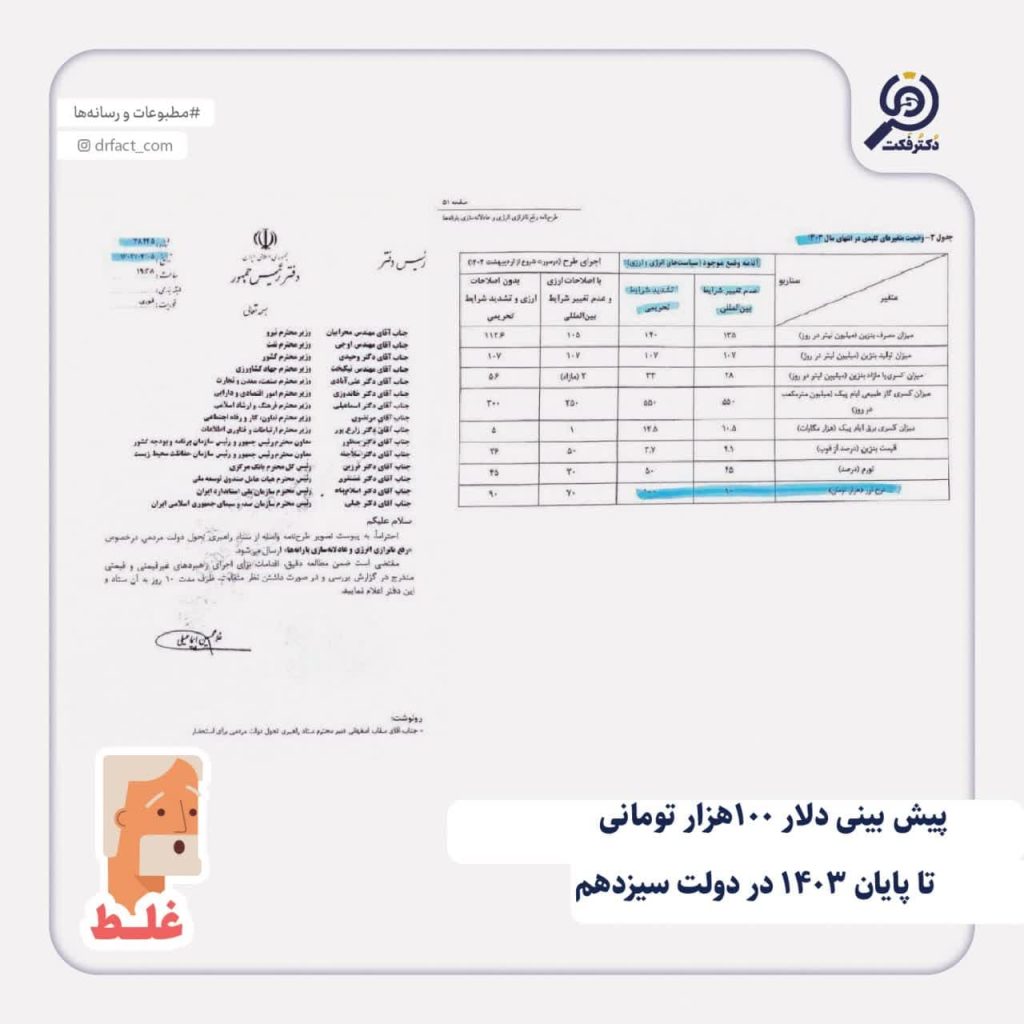 👨⚕️دکتر فکت: بنابراین، این مطلب که دفتر دولت رئیسی، دلار ۱۰۰هزار تومانی را تا پایان سال ۱۴۰۳ پیشبینی کرده است، #نادرست است و تنها، پیشبینی یک مرکز پژوهشی بوده است.